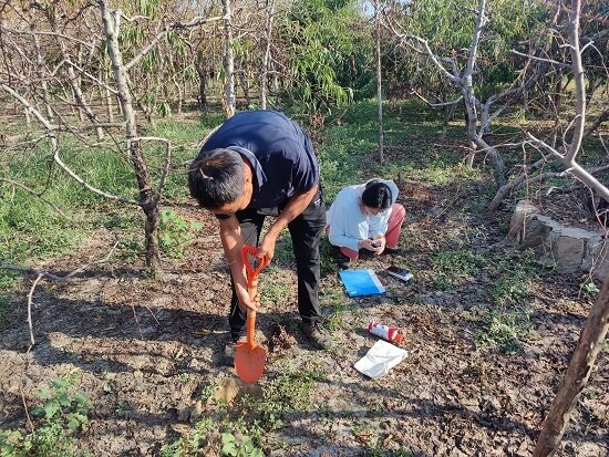 野外取样正值8、9月份,骄阳似火,空气燥热,最高气温接近40度。要在两个月内完成4000个点的取样工作,时间紧、任务重。为确保按期完成,康鹏宇将项目组分成10个小组,早上五点多就背着采样工具和午饭出发,踏着晨光和露水到达第一个点位,下午要到天完全黑才返回驻地,每天在烈日炙烤下持续作业八九个小时。为精准采样,他们携工具徒步爬陡坡、穿灌木丛,“五点取样法”需要挖五个0-20cm深的样坑,有的点位在荆棘丛生的山顶上,有的点位在一人高的灌木丛中,有的点位在坡度很大的山崮上,有的点位在多年未翻耕林地和园地……他们均按要求在设计位置取样,丝毫没有退缩。