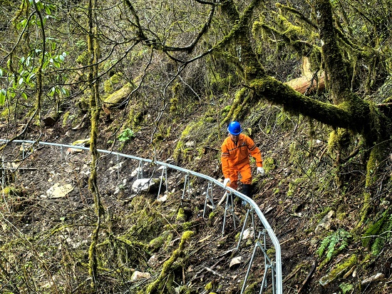 项目专职安全员张鹏带头集思广益,带领团队多方调研求证。最终,一种适用于陡峭山地和林区的轻型单轨运输系统脱颖而出,成为创新破局的最优选择。通过在陡峭山体精准开凿锚固点、架设支撑结构,将轨道稳固悬于半空,再利用单轨自行车厢运送设备物资。这一方案不仅最大程度保护了沿途植被与原始地貌,更显著推进了钻探效率。