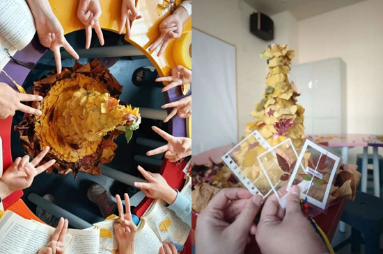 活动尾声,桌上散落的剩余叶片引发了大家的创意灵感,“我们把它们变成一顶帽子吧”,瞬间点燃了集体创作的热情。参与者们纷纷动手,将零散的叶片一一拾起,在协作中交错、叠合、固定,一顶由无数片独特落叶汇聚而成的“集体之帽”渐渐成形,它不属于任何一个人,却属于每一个参与者,象征着个体的独特与群体的联结,温暖而有力量。