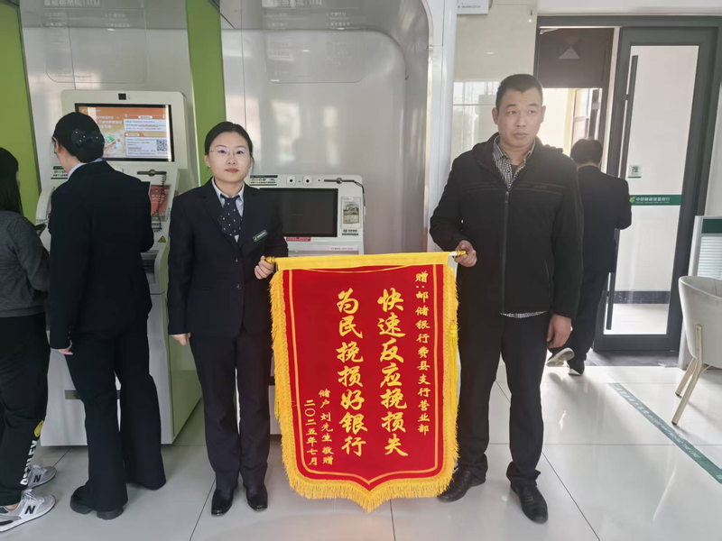 近日,中国邮政储蓄银行费县营业部收到一面写有“快速反应挽损失,为民挽损好银行”的锦旗。