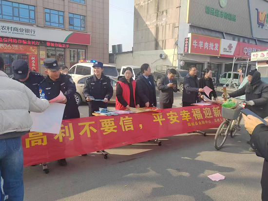 2月4日恰逢郯城县高峰头镇年集,农行郯城高峰头支行与镇政府、镇公安局及当地农商银行,共同开展“投资高利不要信,平安幸福迎新春”宣传活动。