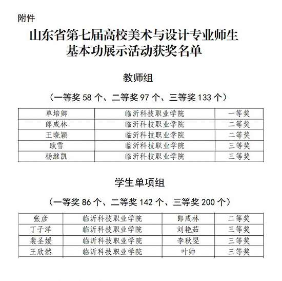 鲁网11月27日讯 近日,山东省教育厅公布“山东省第七届高校美术与设计专业师生基本功展示活动”获奖名单。临沂科技职业学院师生在此次活动中表现优异,斩获教师组一等奖1项、二等奖2项、三等奖2项,学生组二等奖1项,三等奖3项,充分彰显了该校师生扎实的专业功底与良好的综合素养。