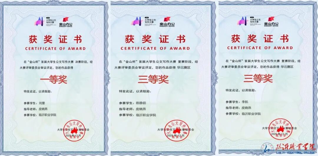 近日,临沂职业学院现代建筑学院学生在“金山杯”首届全国大学生公文写作大赛中喜获佳绩,刘蕾同学荣获一等奖,陈静茹、李航同学荣获三等奖。