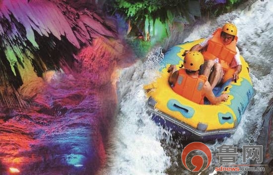 穿过石洞,便来到依附溶洞建成的探险地下漂流,这里全程1200米,是国内首创地上地下穿越漂流项目,为中国溶洞探险第一漂,探险漂流采用声、光、感应控制等高科技手段,营造出“一天历四季、天崩地裂、海底世界、时空隧道、碧波蓝天”等五段梦幻、神奇的体验空间。