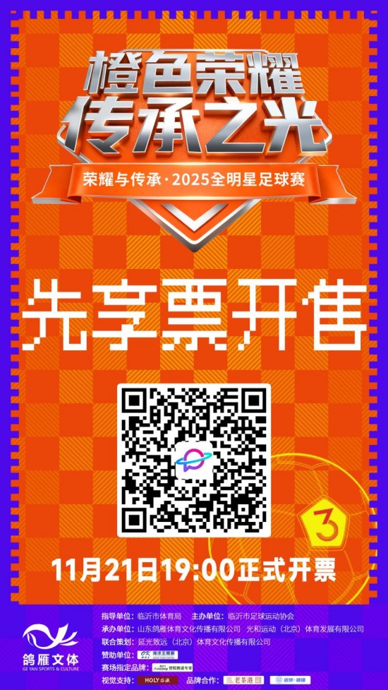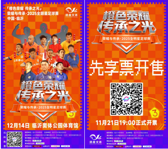 鲁网11月23日讯 (记者 李文静)今年冬天,临沂将迎来一场真正属于球迷的盛宴——“橙色荣耀·传承之光——荣耀与传承·2025全明星足球赛”。11月21日19点,荣耀与传承·2025全明星足球赛先享票正式开售!全明星阵容将于12月14日晚7点齐聚临沂奥体公园体育馆,进行巅峰对决!
