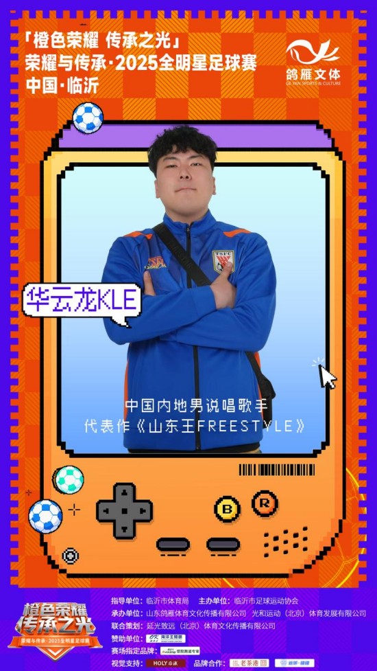 本次荣耀与传承·2025全明星足球赛,重磅邀请广受年轻人喜爱的实力“山东王”华云龙 KLE亲临现场助阵,为赛事增添音乐能量与青年文化的魅力。他将用音乐与足球共振,点燃现场的情绪,让这不是一场纯粹的比赛,而是一场体育与音乐的狂欢!
