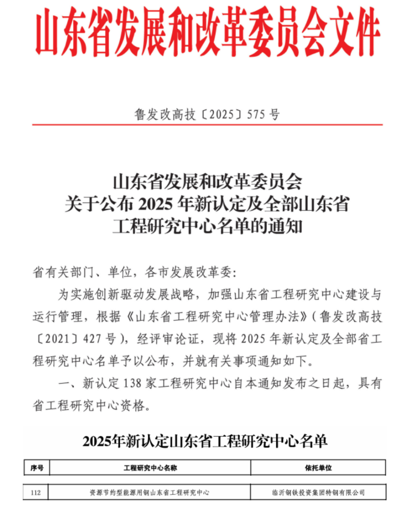 近日,山东省发展和改革委员会正式公布了2025年山东省工程研究中心认定名单,由特钢公司与东北大学联合申报的“资源节约型能源用钢山东省工程研究中心”成功入选,荣获省级工程研究中心认定,这是特钢公司获批的