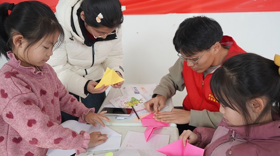 2月12日,临沭县大兴镇文化社区寒假爱心托管班的大学生志愿者正在教小朋友们学做手工折纸、绘画。